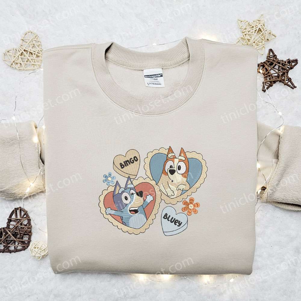 Bluey And Bingo Hearts Embroidered Shirt, Bluey Cartoon Embroidered Shirt, Disney Embroidered Shirt