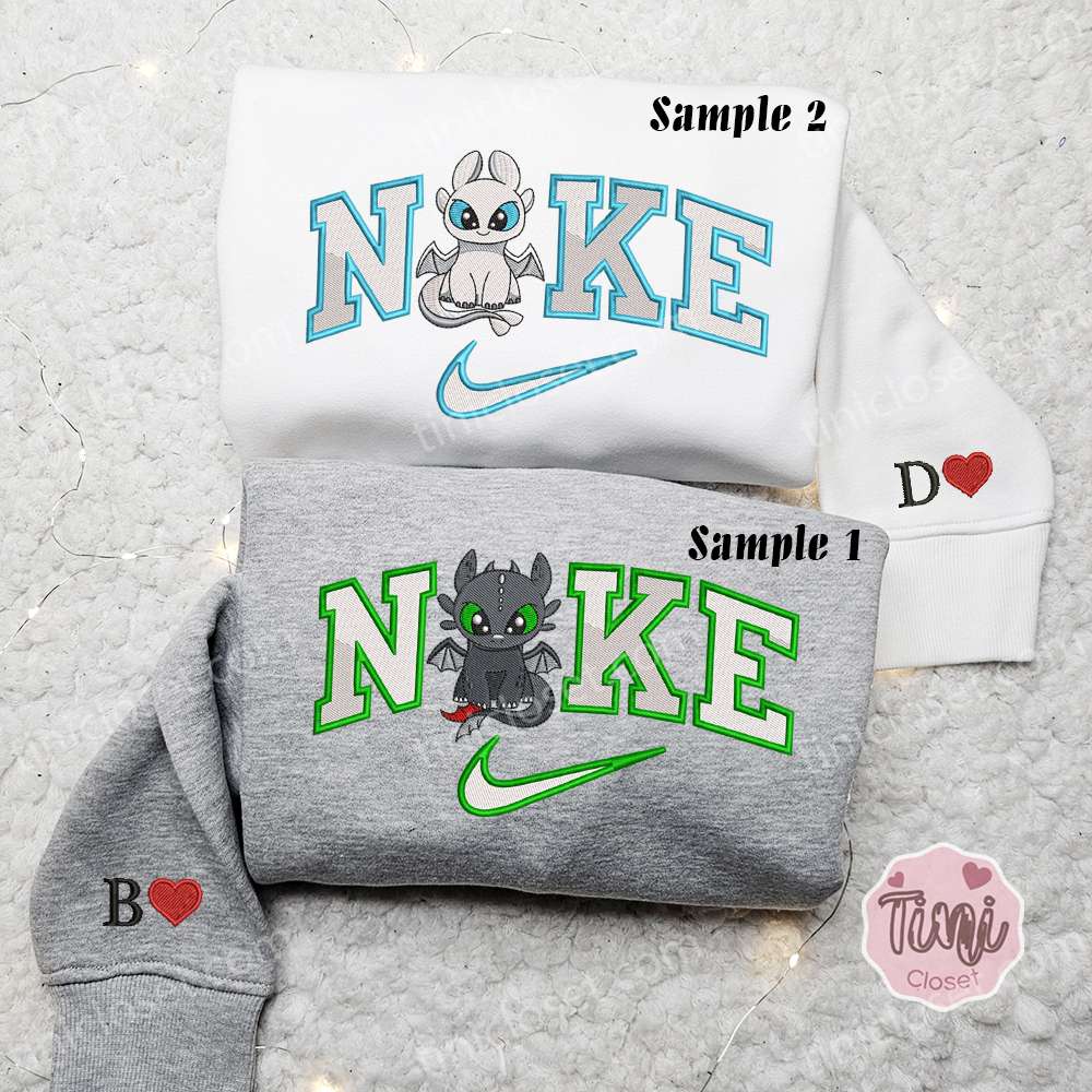 Chibi Toothless And Light Fury x Nike Couple Embroidered Shirt, How To Train Your Dragon Cartoon Embroidered Hoodie, Valentine’s Day Embroidered Sweatshirt