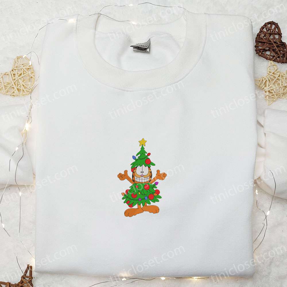 Garfield Christmas Tree Embroidered Shirt, Cartoon Embroidered Hoodie, Best Christmas Gifts For Family