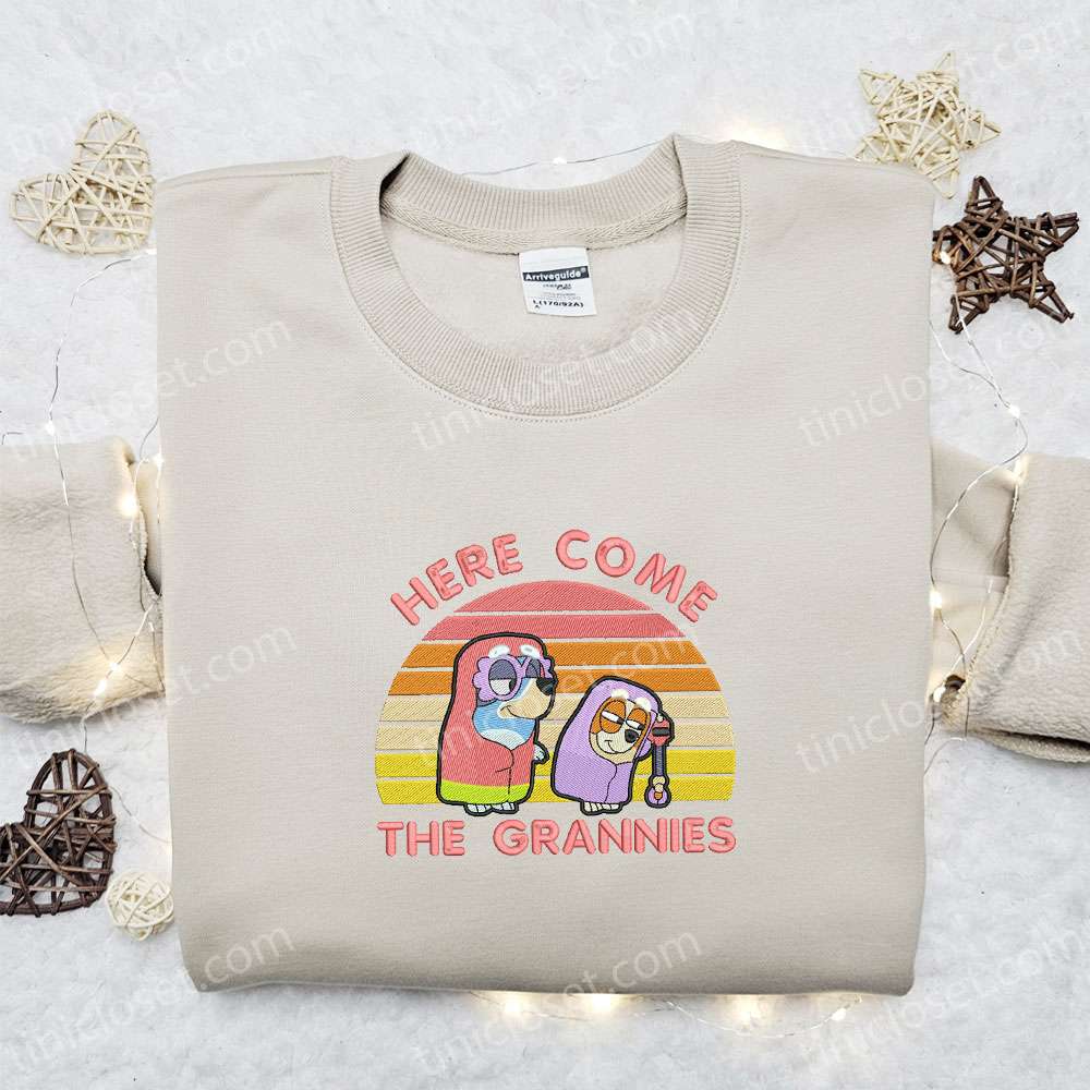 Here Come The Grannies Embroidered Shirt, Bluey Cartoon Embroidered Shirt, Disney Embroidered Shirt
