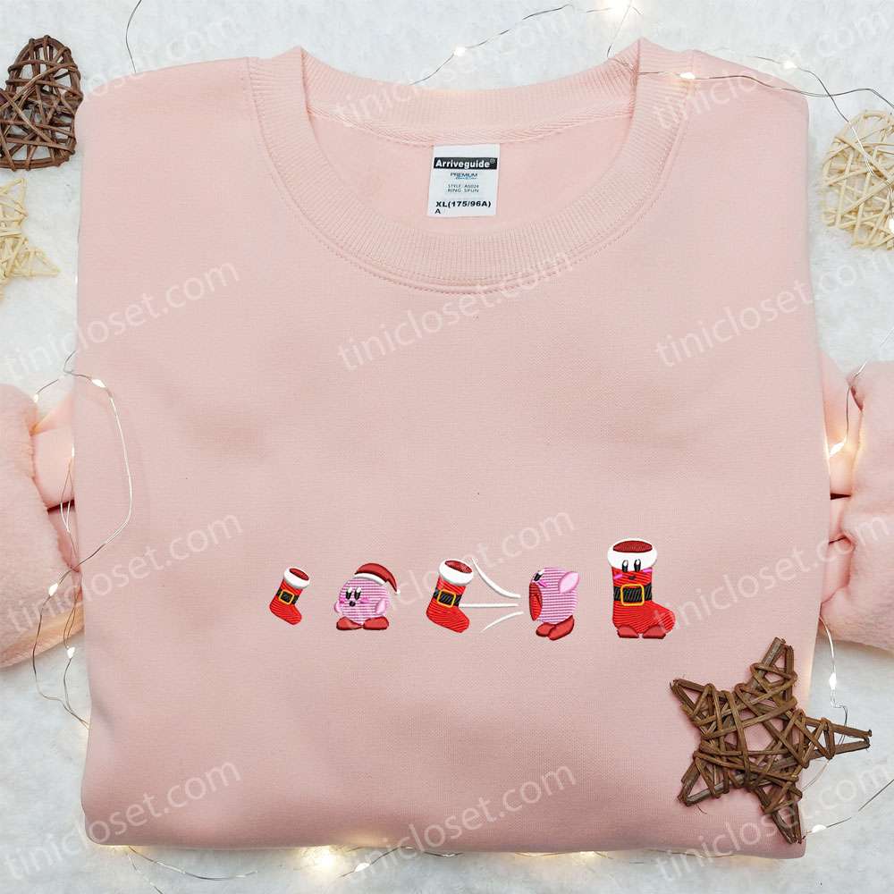 Kirby Eating Christmas Stocking Embroidered Shirt, Game Character Embroidered Hoodie, Christmas Embroidered Sweatshirt