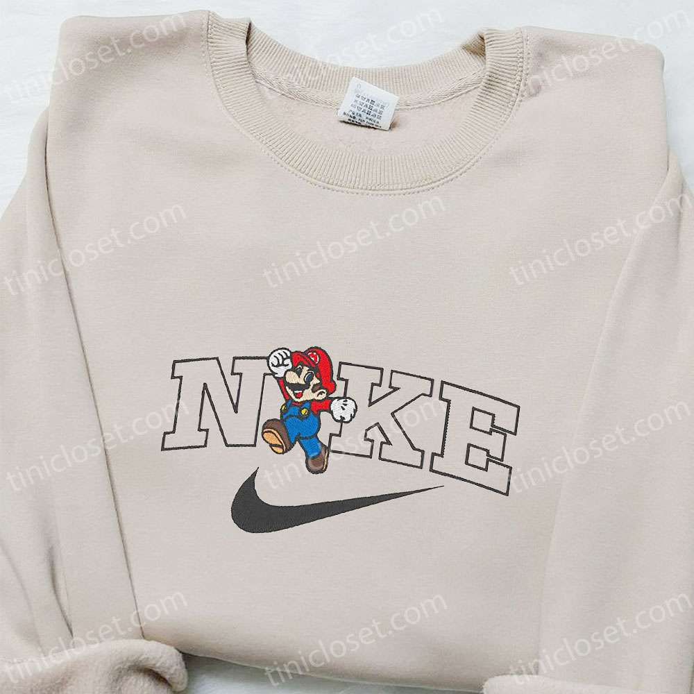 Mario x Nike Cartoon Embroidered Shirt, Super Mario Embroidered Hoodie, Custom Nike Embroidered T-shirt