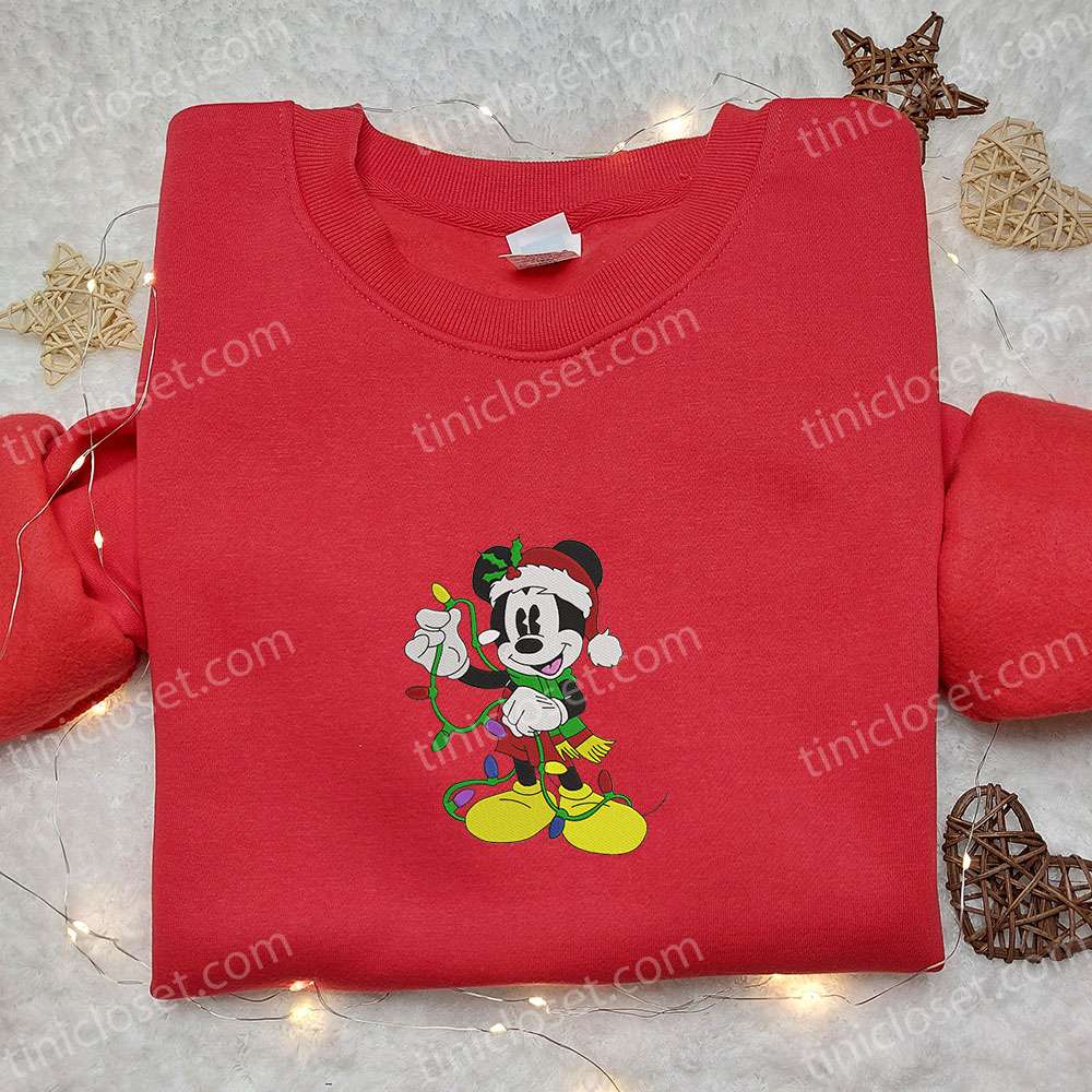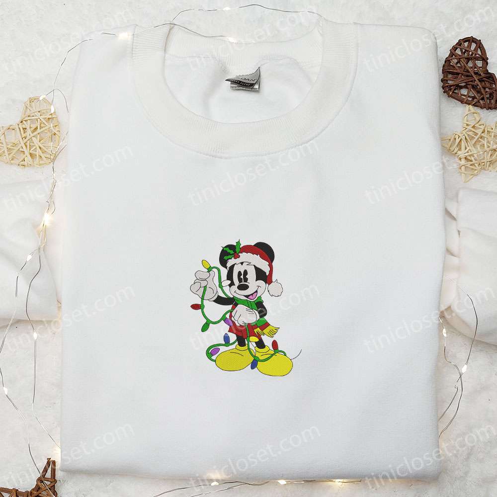 Mickey With Christmas Lights Embroidered Shirt, Disney Characters Embroidered Hoodie, Christmas Embroidered Sweatshirt