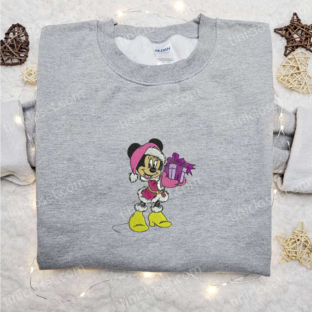 Minnie Mouse With Present Embroidered Shirt, Disney Characters Embroidered Hoodie, Best Christmas Gifts For Family