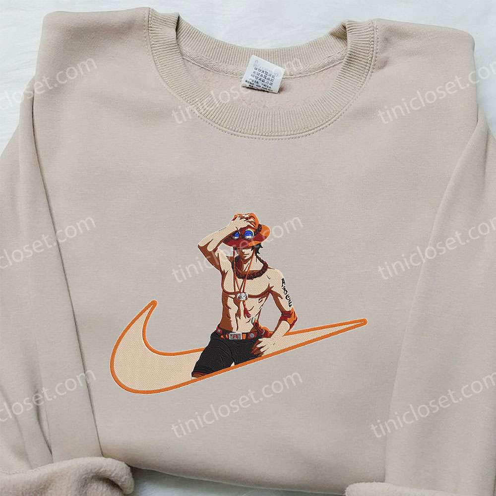 Portgas D. Ace x Nike Swoosh Anime Embroidered Hoodie, One Piece Embroidered Shirt, Nike Inspired Embroidered Shirt