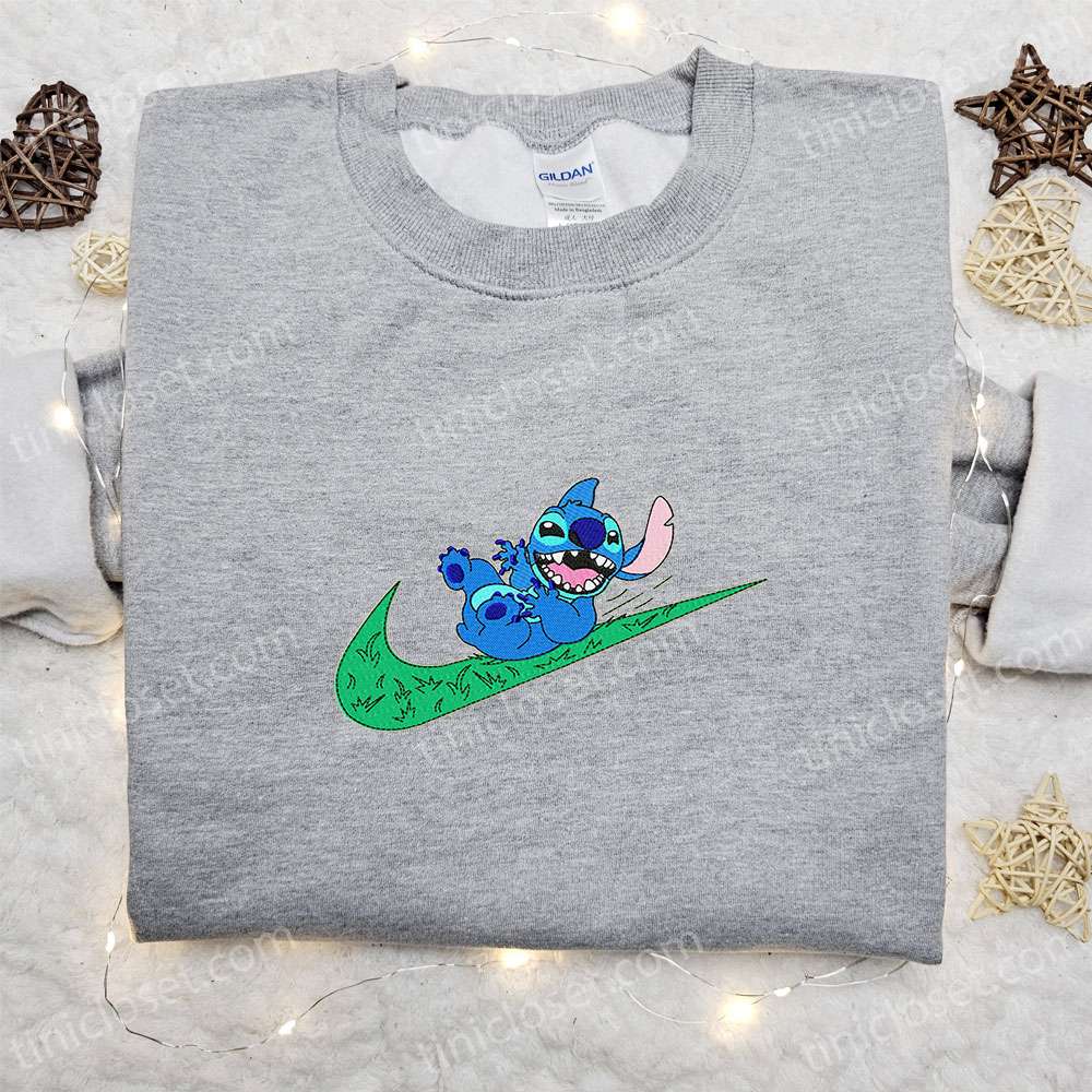 Stitch x Nike Swoosh Cartoon Embroidered Tshirt, Nike Inspired Embroidered Shirt, Best Gift for Family