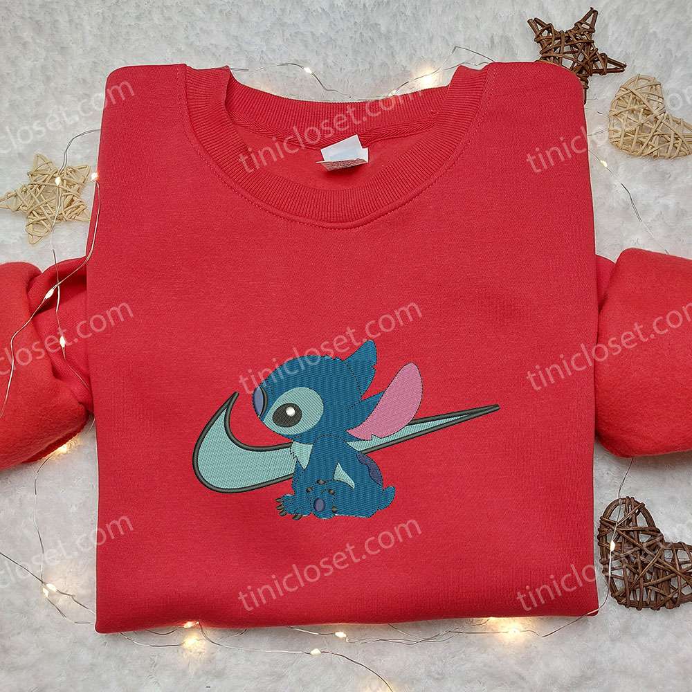 Stitch x Nike Swoosh Embroidered Sweatshirt, Lilo and Stitch Cartoon Embroidered Shirt, Nike Inspired Embroidered Shirt
