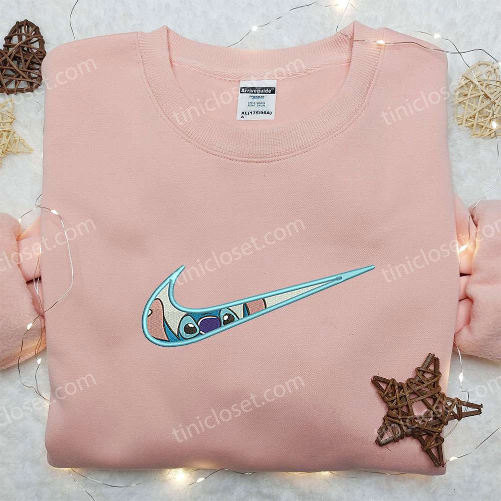 Stitch x Nike Swoosh Embroidered Sweatshirt, Lilo and Stitch Cartoon Embroidered Shirt, Nike Inspired Embroidered Shirt
