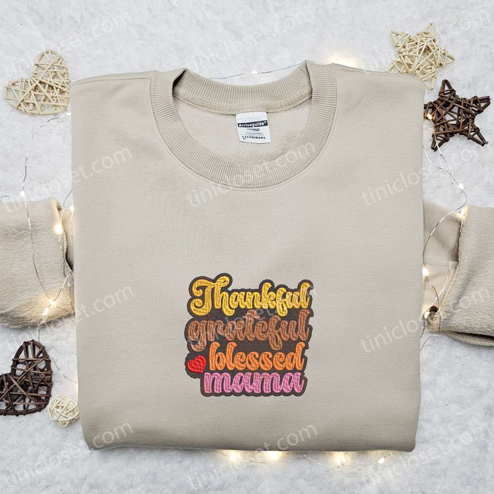 Thankful Grateful Blessed Mama Autumn Embroidered Hoodie, Custom Embroidered T-shirt, Best Gift Ideas For Moms