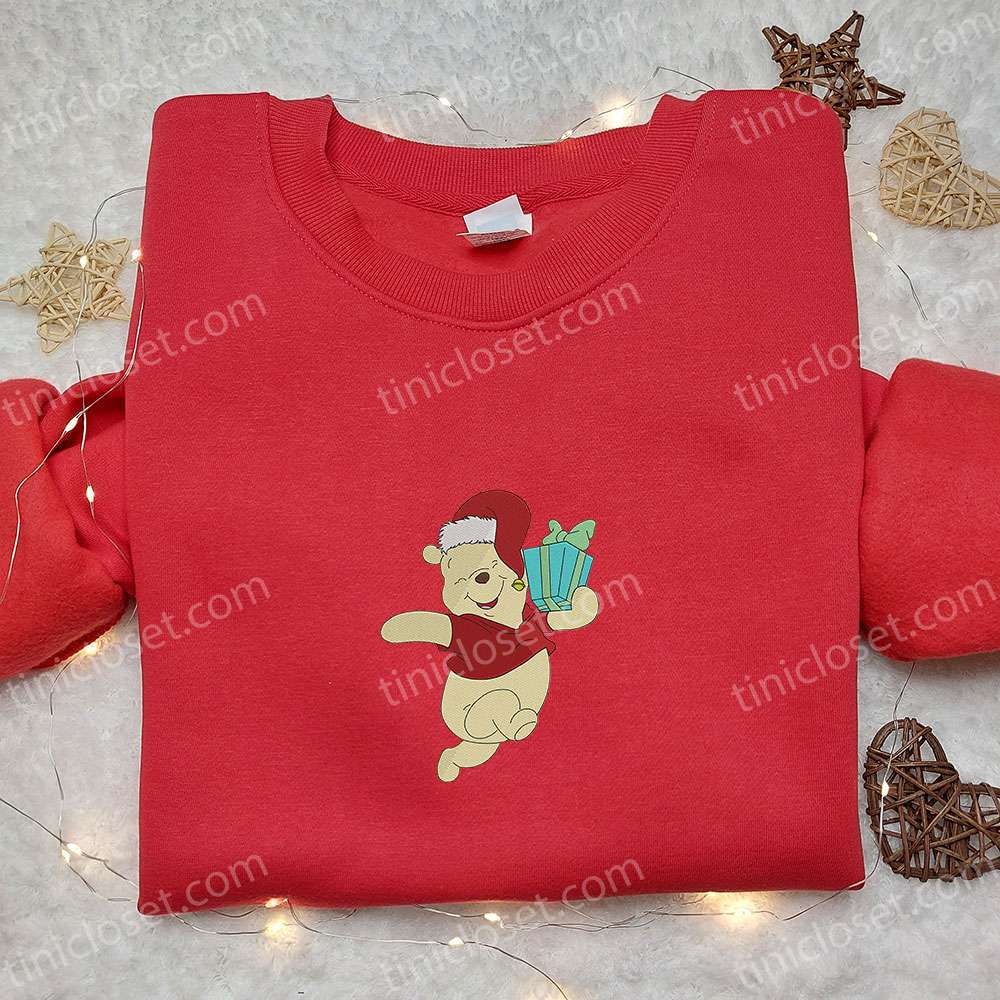 Winnie The Pooh Happy Running With Christmas Gift Embroidered Shirt, Disney Characters Embroidered Hoodie, Christmas Embroidered Sweatshirt